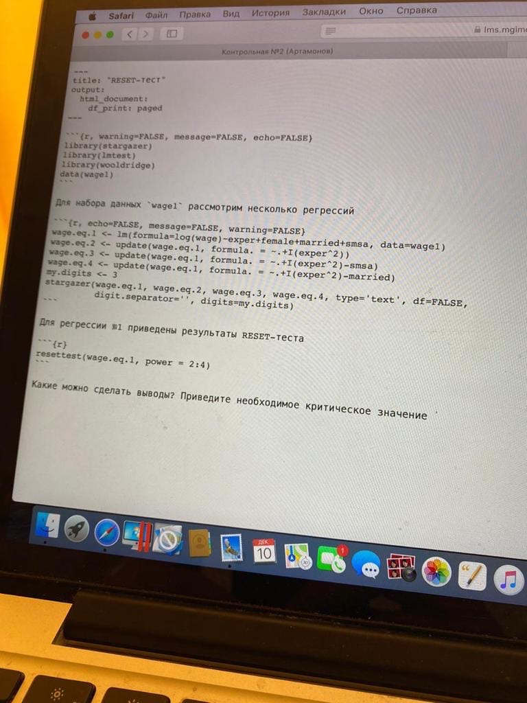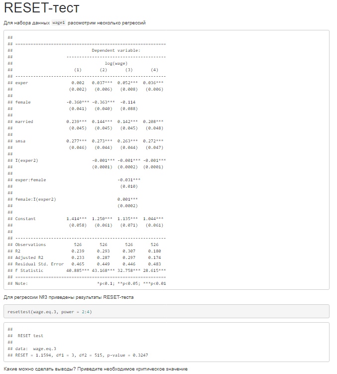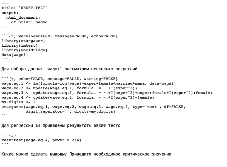 Данный материал представляет собой сборник практических заданий по эконометрике с использованием языка программирования R. В статье рассматриваются методы построения регрессионных моделей на базе наборов данных wage1 и sleep75, проведение RESET-теста для проверки спецификации модели, а также интерпретация статистически значимых коэффициентов. Материал включает программный код, результаты вычислений и методические указания по анализу полученных данных.