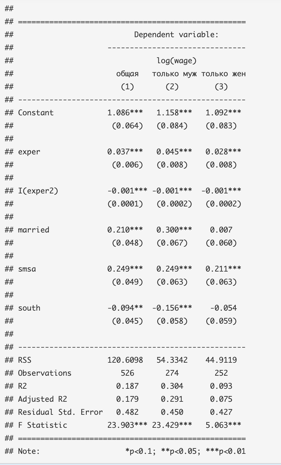 Ниже представлен код для анализа набора данных wage1 с использованием языка R.