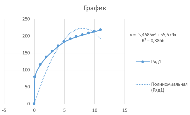 Выбираем степень полинома равную 3, при такой степени достоверность аппроксимации составляет 88,66%.