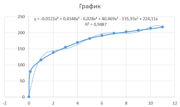 Для большей точности совпадения линии тренда и графика выбираем степень полинома так, чтобы величина достоверности аппроксимации (R²) была максимально приближена к единице.
