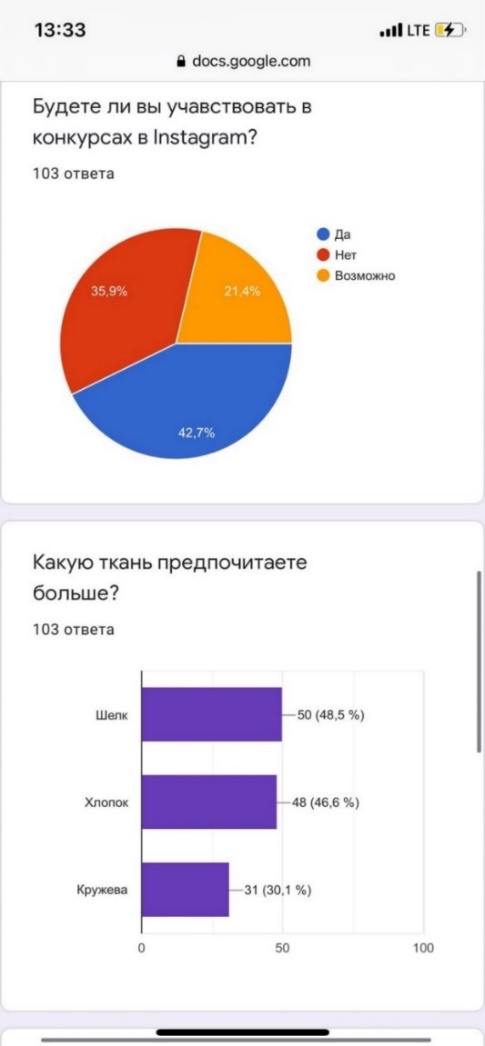 | Какую ткань предпочитаете? | Шелк: 48,5%; Хлопок: 46,6%; Кружева: 30,1% |