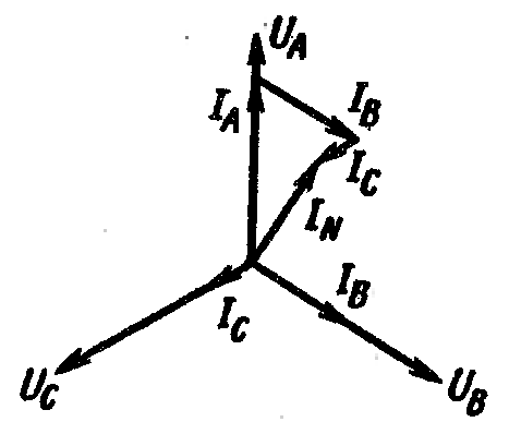 К четырехпроводной сети 220 В подключена нагрузка (звезда) с мощностями PA = 3 кВт, PB = 1.8 кВт, PC = 0.6 кВт. Определить ток в нейтральном проводе.