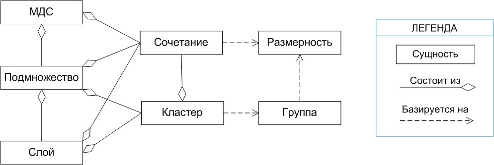 - В каждом подмножестве Si должны быть выделены слои измерений Li,j, где j – номер слоя в подмножестве, li – количество слоев, Li,j – номер измерения в слое, ni,j – количество измерений в i-м слое. Слой измерений – это набор измерений, сочетаемость значений которых во множестве не зависит от того, какие значения в сочетаниях принимают измерения, не входящие в слой. В случае если известны подмножества сочетаний значений измерений для каждого из слоев измерений, подмножество сочетаний Si может быть получено при помощи декартова произведения по слоям: МДС(Si) = Mi,1 × Mi,2 × … × Mi,li. Здесь Mi,j – множество сочетаний значений измерений i-го слоя.