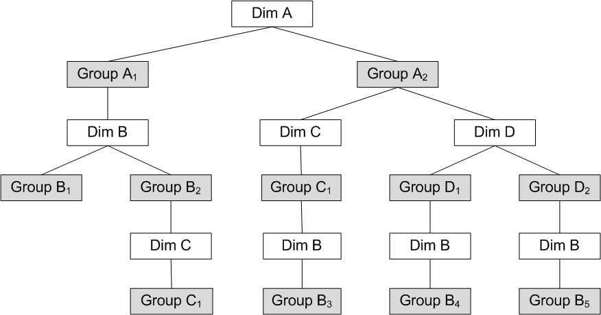- Дерево представляет собой иерархическую структуру, в которой уровни задаются чередованием узлов типа «Группа значений измерения» и узлов типа «Измерение». При этом группы значений измерений должны быть заданы в измерениях, соответствующих узлам, расположенным в дереве на один уровень выше по иерархии.