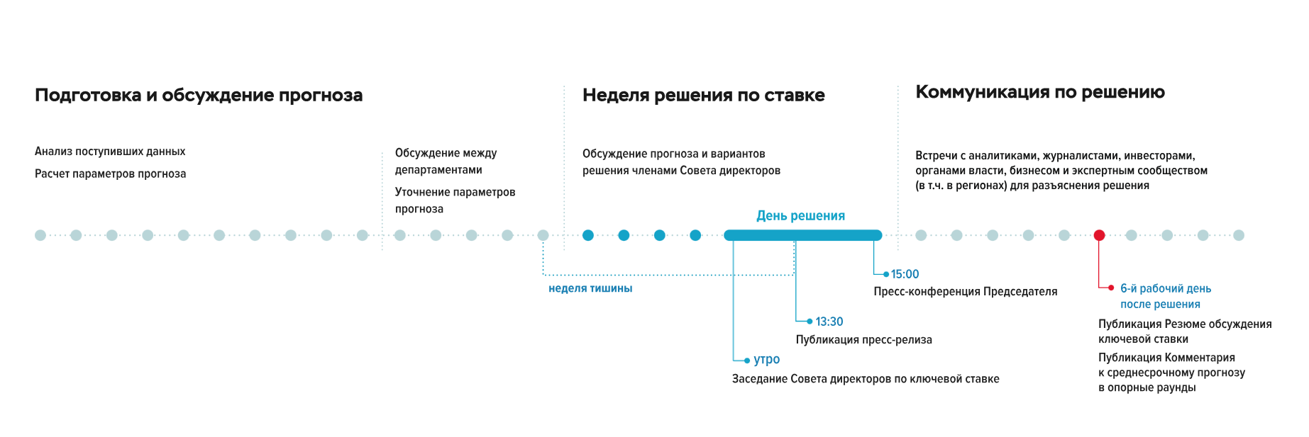 Принятие решения относительно ключевой процентной ставки всегда сопровождено обоснованием его логики и причин. Обычно оно также включает сигнал о возможных будущих действиях в сфере денежно-кредитной политики. Объяснения, предоставленные Банком России по принятым решениям и дальнейшим планам, служат важным инструментом для управления инфляционными ожиданиями, так называемой их привязкой к установленной цели по инфляции.