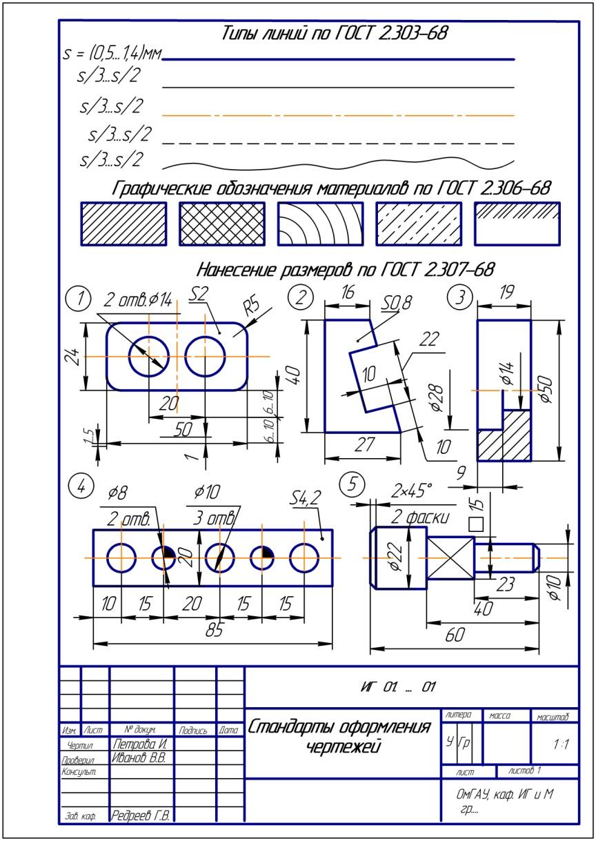 Цель: изучение ГОСТов: форматы – ГОСТ 2.301-68, масштабы — ГОСТ 2.302-68, линии — ГОСТ 2.303-68, шрифты чертежные — ГОСТ 2.304-80, обозначения графические материалов — ГОСТ 2.306-68, нанесение размеров — ГОСТ 2.307-68.