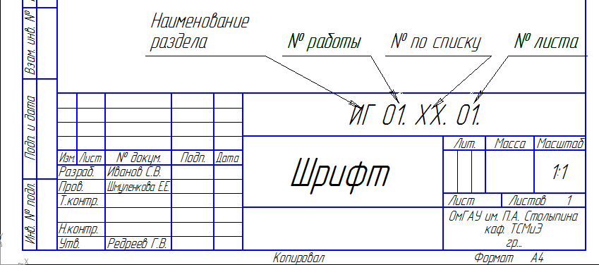 . В основной надписи написать свою фамилию, фамилию преподавателя, заведующего кафедрой, номер группы и номер работы: ИГ 01. ХХ. 01, где ХХ – ваш номер по списку группы.