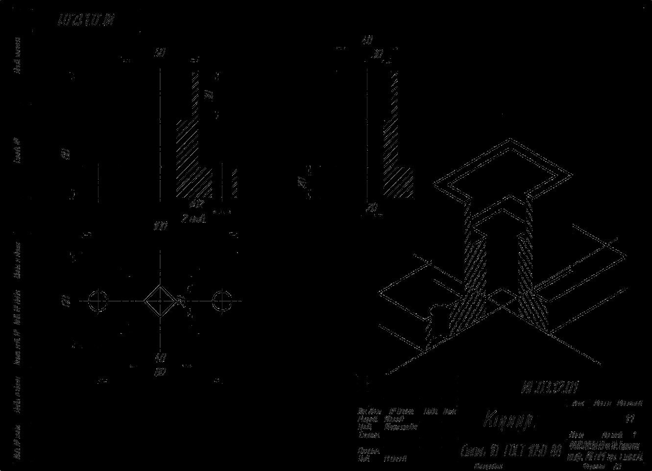 Содержание: на формате А3 вычертить два данных вида детали и построить вид слева. Выполнить половинчатые разрезы на главном виде и слева. Начертить изометрию с вырезом ¼ части. Нанести размеры. Заполнить основную надпись. Номер работы: ИГ 03. ХХ. 01. Вариант задания берется по последней цифре в зачетке из таблицы 3.