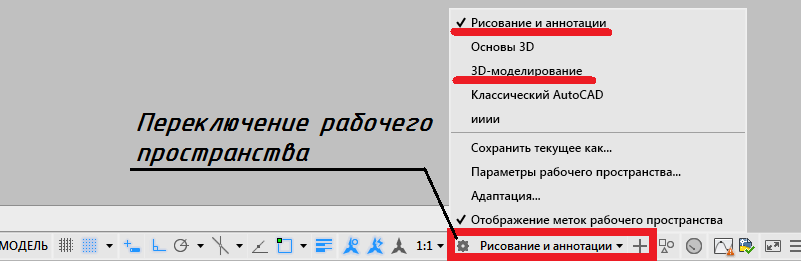 По умолчанию AutoCAD загружается в рабочем пространстве для двухмерного моделирования, которое называется «Рисование и аннотации». Для трехмерного проектирования предназначено рабочее пространство «3D Моделирование». Переход между рабочими пространствами осуществляется по щелчку клавиши мыши по кнопке «Переключение рабочего пространства» в строке состояния, в правом нижнем углу окна AutoCAD