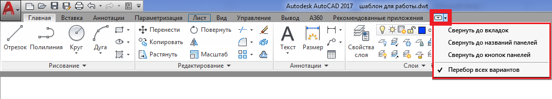 Необходимо отметить наличие кнопки в конце названий вкладок. Она позволяет регулировать отображение ленты инструментов: можно сразу выбрать нужное значение