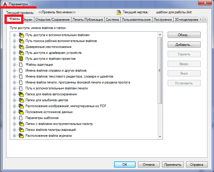 - Вкладка «Файлы». На этой вкладке задаются пути доступа к файлам поддержки, где хранятся шрифты, шаблоны рисунков, типы линии и образцы штриховок, используемые AutoCAD.