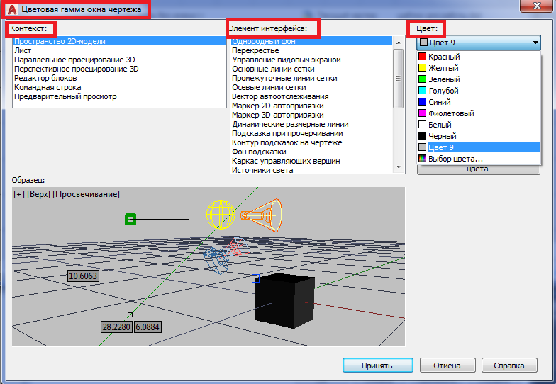 . Все построения выполняются в пространстве модели. По умолчанию цвет пространства модели установлен черный (при печати чертежей фон чертежа останется, как принято, белым). Считается, что при работе на черном фоне меньше устают глаза. При желании можно изменить цвет пространства модели.