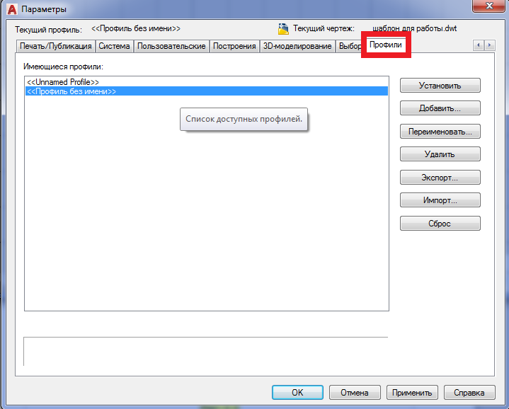 - Вкладка «Профили». Эта вкладка используется для создания профилей и сохранения в них параметров среды рисования