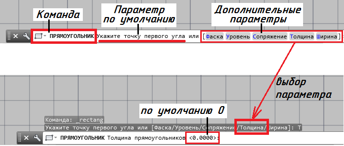Под лентой расположена рабочая область, которая служит для создания и редактирования чертежей. В нижней части расположена командная строка (окно команд). Окно команд состоит из двух частей: нижней и верхней. Нижняя часть предназначена для ввода команд с клавиатуры. В верхней части выдается информация − какие действия AutoCAD ожидает от пользователя.