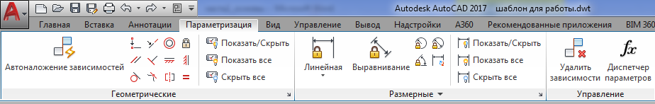 - Параметризация – содержит инструменты для задания геометрических и размерных зависимостей, а также управления имеющимися зависимостями на чертеже