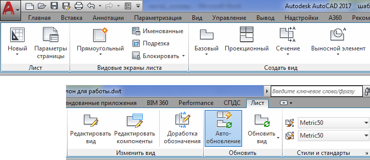 - Лист — вкладка для работы с видовыми экранами и видами