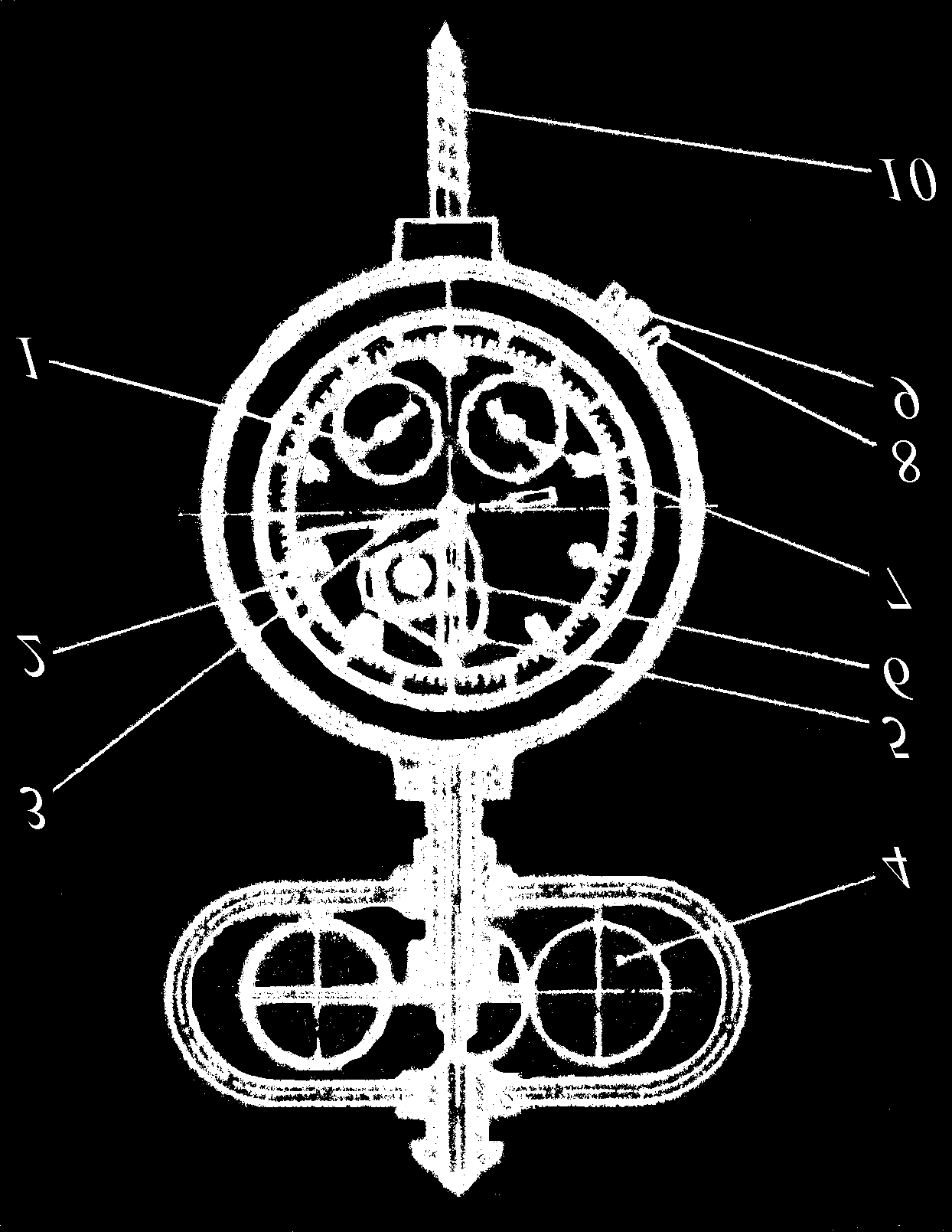 с диапазоном измерения средней скорости воздуха от 1 до 20 м/с. Движение воздуха анемометр воспринимает четырехчашечной вертушкой 4, насаженной на ось 5. На нижнем конце вертушки имеется червячная передача, передающая движение трем стрелкам. Циферблат 2 имеет соответственно шкалы единиц, сотен и тысяч.