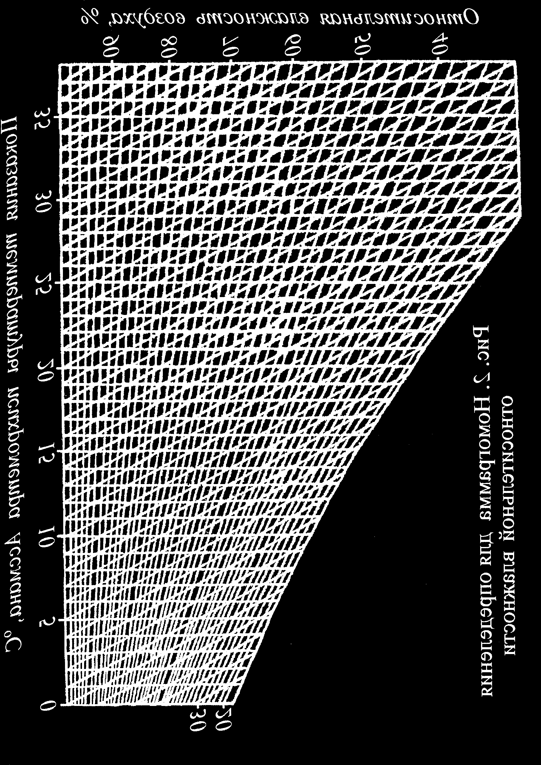 - в) определить температуру воздуха по показаниям сухого и влажного термометров и соответственно определить Pс и Pв при данных значениях температуры.