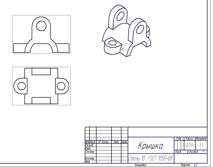 - 4. Этап. По 3D модели создать чертеж (формата А3) и два вида детали (главный и вид сверху) и изометрию.