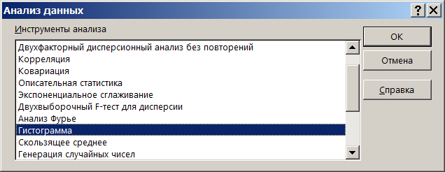 На вкладке «Данные» выбрать пункт «Анализ данных». В раскрывшемся меню выбрать пункт «Гистограмма».