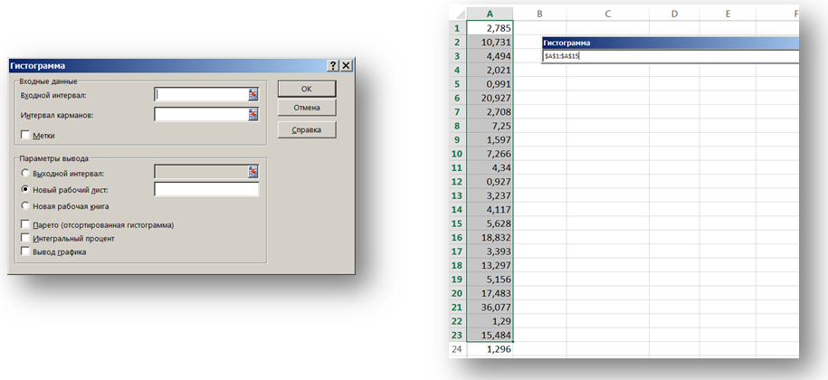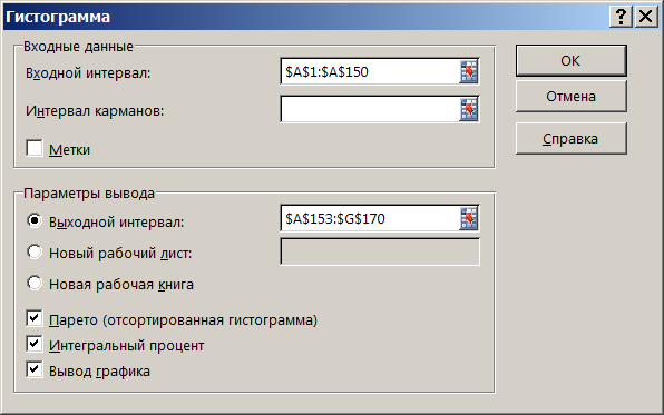 Программа позволяет автоматически сформировать границы интервалов, но можно задать границы интервалов (карманов) самостоятельно. Для этого необходимо сначала в произвольных ячейках указать границы интервалов, а затем в диалоговой форме «Гистограмма» ввести ссылку на эти ячейки.