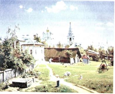Теперь рассмотрим другой пейзаж, написанный русским художником Василием Поленовым в 1878 — 1879 гг., «Московский дворик». Картина находится в Третьяковской галерее в Москве.