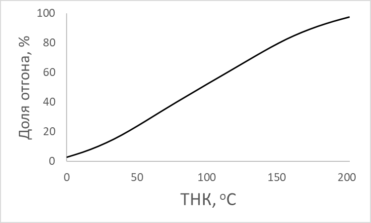 В таблице приведены данные разгонки широкой бензиновой фракции. Постройте серию эмпирических моделей в виде алгебраических степенных полиномов от 1-ой до 5-ой степени. Для каждого случая постройте график зависимости экспериментальных и модельных значений доли отгона от температуры начала кипения (ТНК). Оцените адекватность каждой модели, а также сравните модели между собой, рассчитав коэффициент детерминации и остаточную сумму.