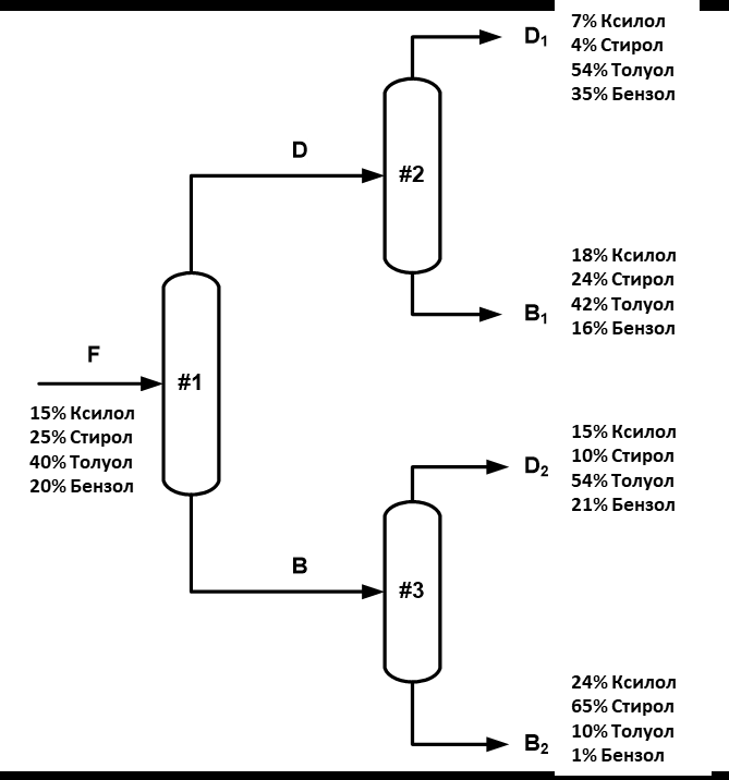 Задача 1. Найдите состав и мольный расход всех потоков на схеме разделения смеси ксилол, стирол, толуол, бензол
