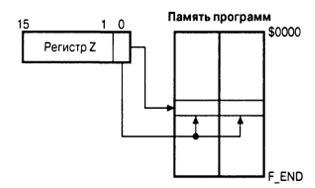 Поскольку микроконтроллеры AVR имеют 16-битную систему команд, объем памяти программ на рис. указан не в байтах, а в 16-битных словах. Символ «$» перед числом означает, что это число записано в шестнадцатеричной системе счисления.