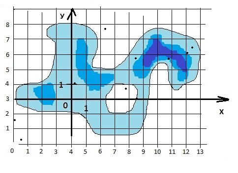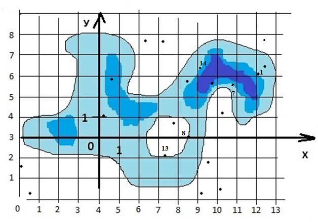 Так как начало координат находится посередине фигуры, перенесем его так, чтобы фигура находилась в положительных областях X и Y. Впишем фигуру в прямоугольник со сторонами длиной 13 км по оси X и 8 км по оси Y.