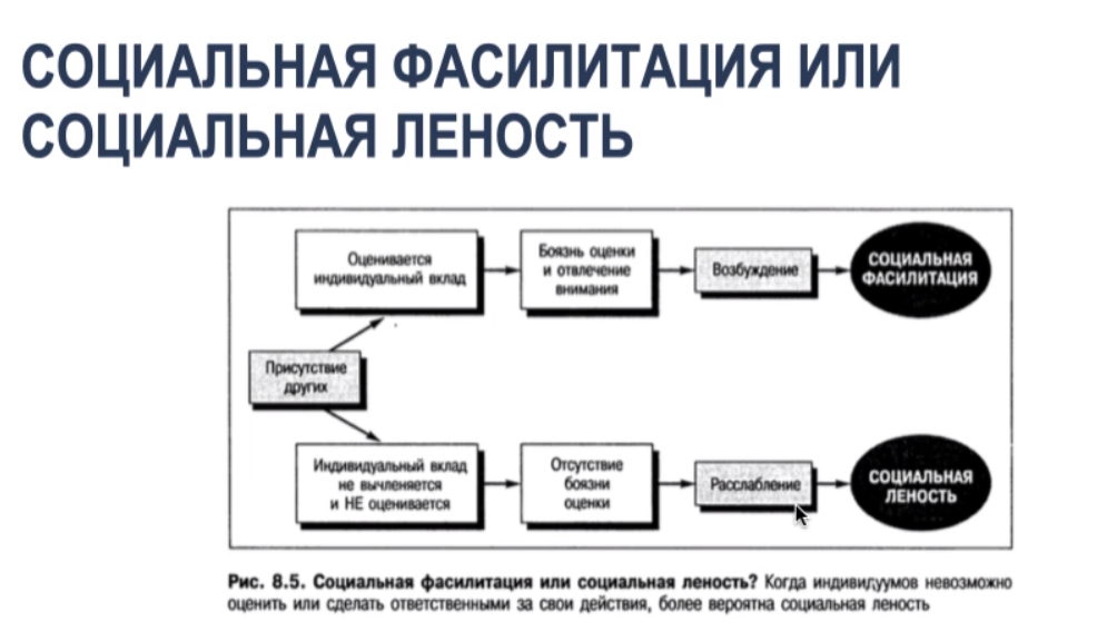 - Социальная леность: люди в группах прикладывают меньше усилий из-за анонимности и низкой значимости целей.