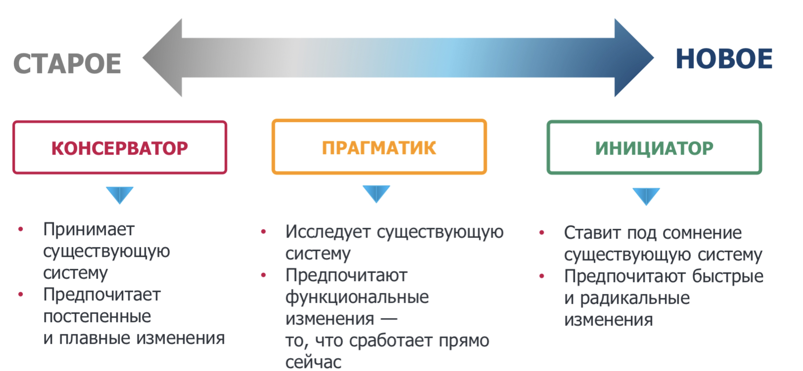 - Прагматики: предпочитают практичные изменения, гибкие, ориентированы на результат.