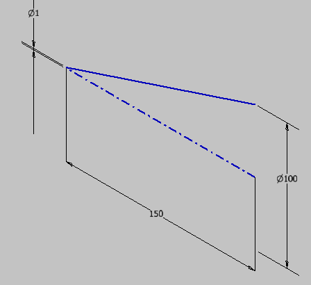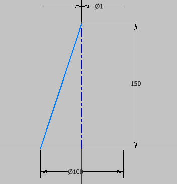 (рис.). Проставим необходимые размеры. Диаметр 1мм между верхней конечной точкой образующей и осью. Диаметр 100мм между нижней конечной точкой образующей и осью (рис.).