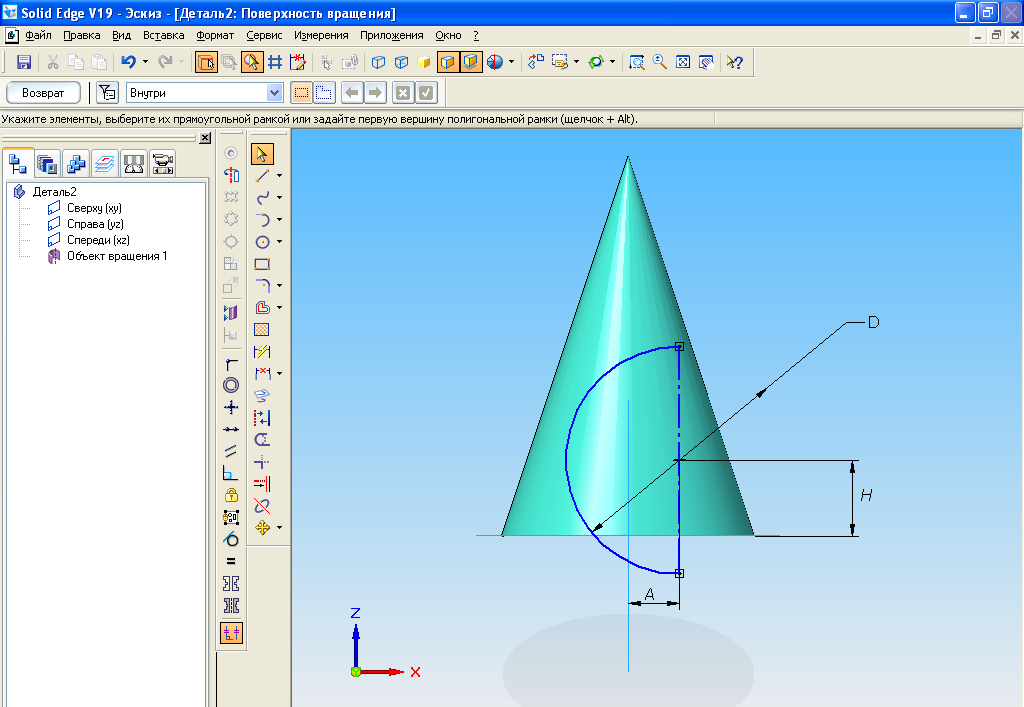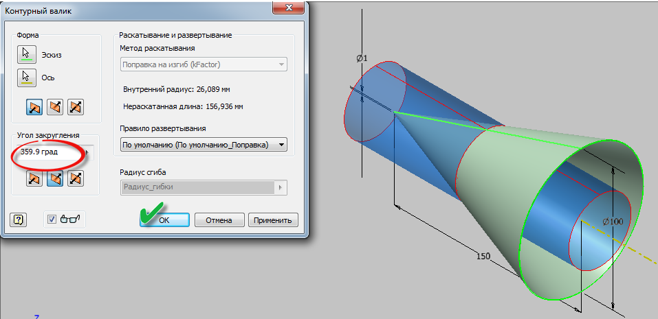 Выставляем угол закругления 359,9 град. Нажимаем кнопку «Ок». Получаем конус (рис.).