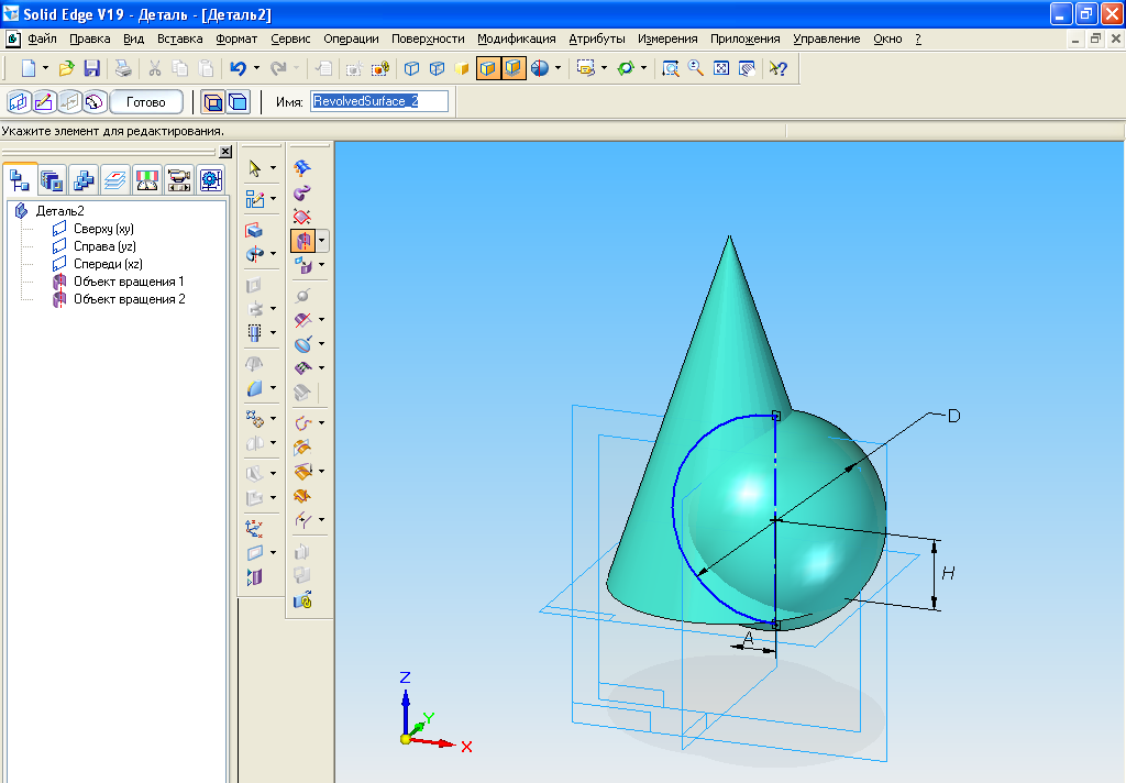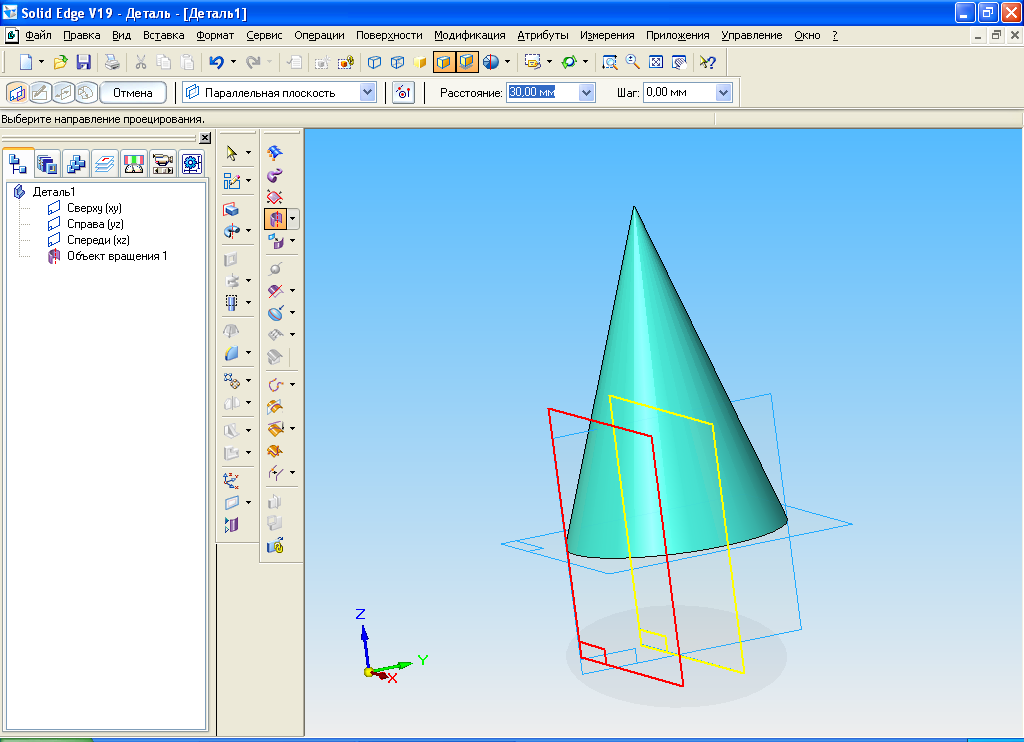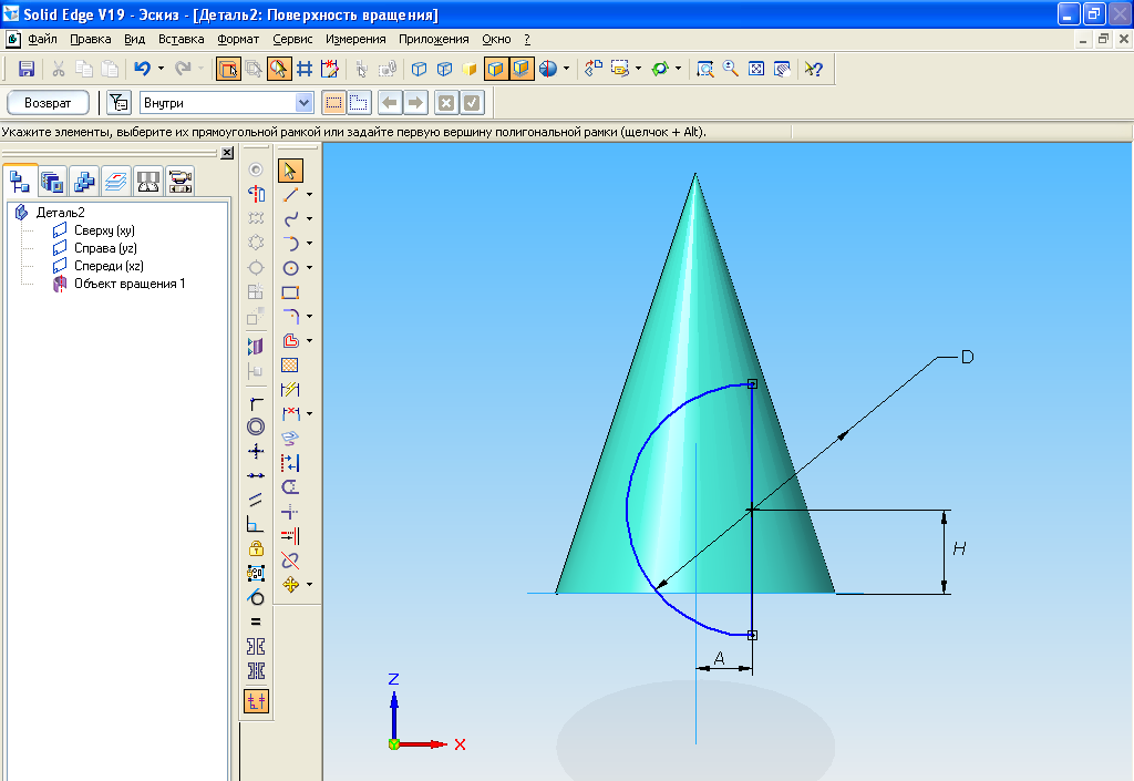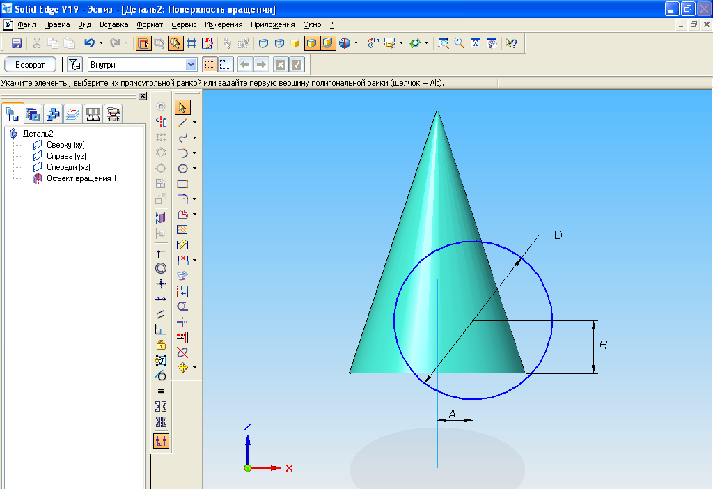 - В качестве конструктивной плоскости построения выберем плоскость X-Z, если центры оснований конусов лежат в плоскости, параллельной фронтальной плоскости проекций (т.е. В=0). Если нет, то, используя кнопку