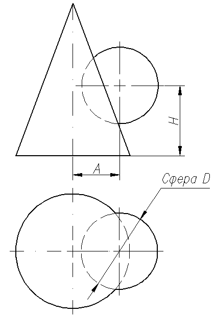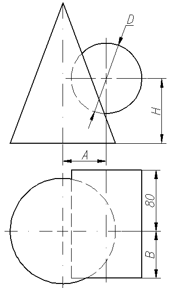 Построить линию пересечения поверхности прямого кругового конуса (диаметр основания – 100 мм, высота – 150 мм) с заданной поверхностью вращения. Определить видимость, вычертить развертку конуса с нанесением линии пересечения. Задание выполнить по вариантам, приведенным в табл. 1.