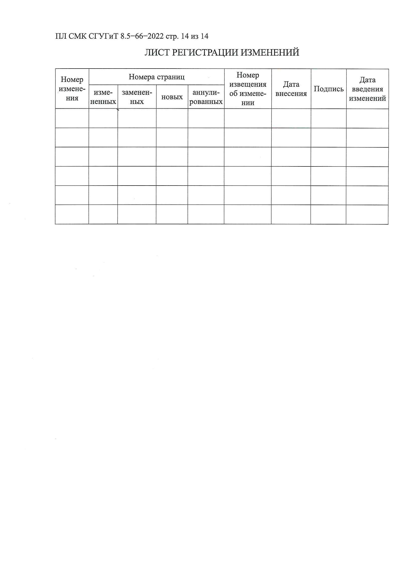 | Номер изменения | Номера страниц (замененных, аннулированных, новых) | Номер извещения об изменении | Дата внесения | Подпись | Дата введения изменений |