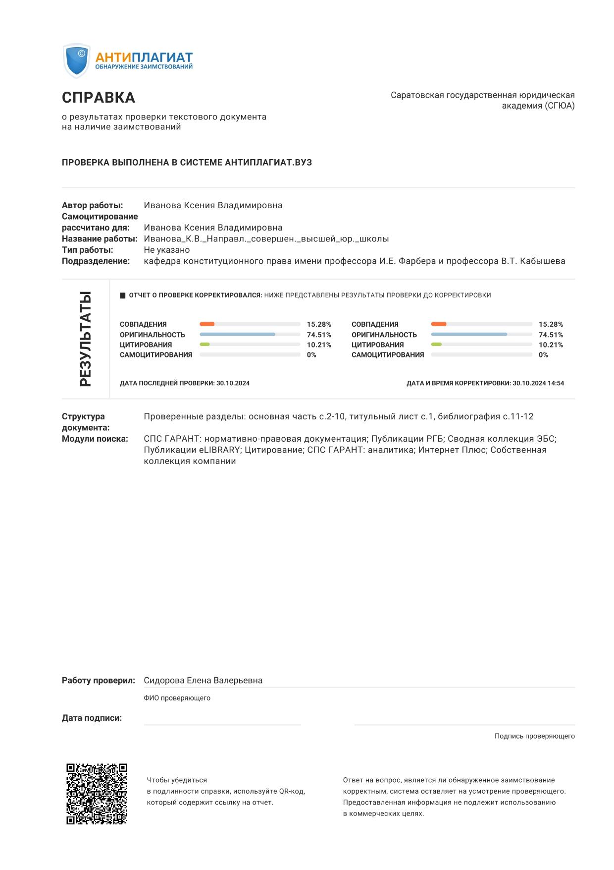 Итоговая оценка оригинальности составляет _____.