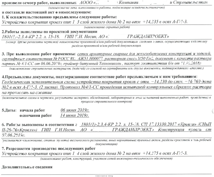 3 В п. 1 АОСР некорректно указано наименование скрытых работ. Указано «кровля тип 1, 3 слой».