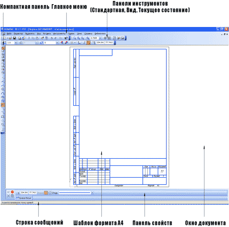 Основные элементы интерфейса: 1) Главное меню, 2) Панели инструментов (Стандартная, Вид, Текущее состояние), 3) Компактная панель, 4) Строка сообщений, 5) Панель свойств.