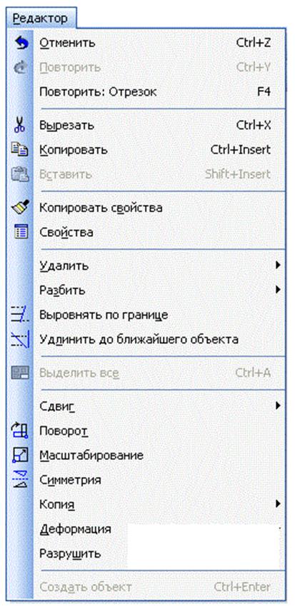 Редактирование: сдвиг, поворот, масштабирование, симметрия, копирование, деформация сдвигом, усечь кривую, разбить кривую, очистить область.