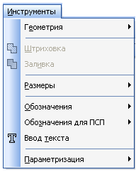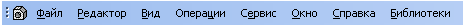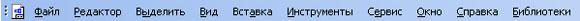 Главное меню двухмерного документа «Чертеж» содержит следующие элементы: Меню Файл, Редактор, Выделить, Вид, Вставка, Инструменты, Сервис, Окно, Справка, Библиотеки.