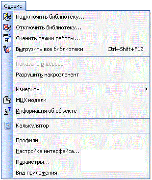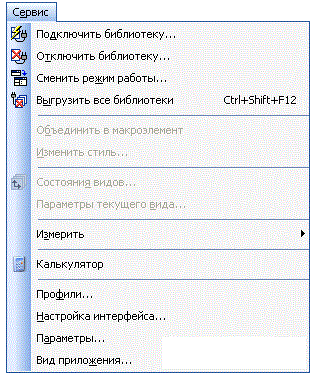 Меню Сервис: Подключить/отключить библиотеку, Объединить в макроэлемент, Изменить стиль, Измерить, Профили, Настройка интерфейса, Параметры, Вид приложения.
