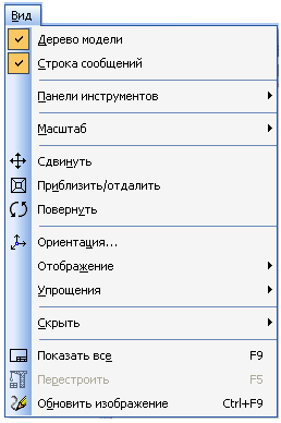 Меню Вид: Дерево построения, Строка сообщений, Панели инструментов, Масштаб, Сдвинуть, Приблизить/отдалить, Показать все, Перестроить, Обновить изображение.