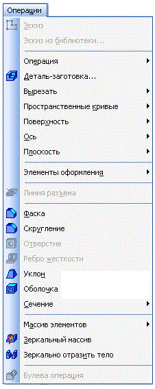 Меню Операции: Эскиз, Эскиз из библиотеки, Операция (выдавливание, вращение, кинематическая, по сечениям), Деталь-заготовка, Вырезать, Пространственные кривые, Поверхность, Ось, Плоскость, Элементы оформления, Линия разъема, Фаска, Скругление, Отверстие, Ребро жесткости, Уклон, Оболочка, Сечение, Массив элементов, Зеркальный массив.