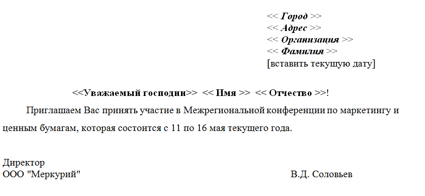 - В окне с основным документом в появившейся панели инструментов слияние нажмите кнопку «Добавить поле слияния» и выберите поле «Город». Используя команды форматирования, расположите поля слияния и основной текст, как показано на примере (Рис. 1). При необходимости установите другой размер и вид текста для полей слияния, предварительно выделив это поле.
