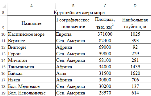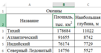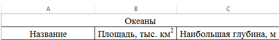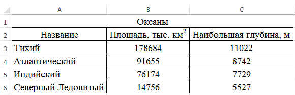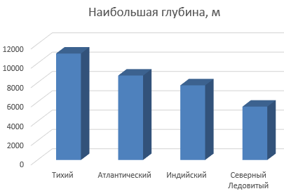 Для построения диаграммы Глубина океанов выделите первый столбец таблицы (Название), удерживая нажатой клавишу [Ctrl], выделите последний столбец (Наибольшая глубина, м):