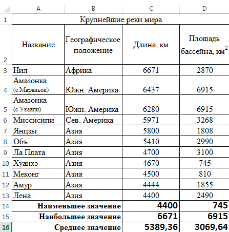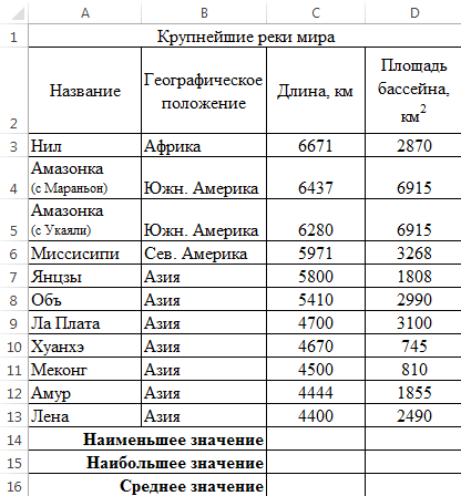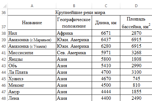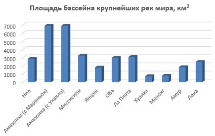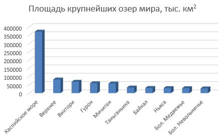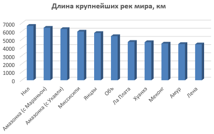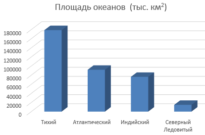 Перейдите на Лист 1. Самостоятельно постройте диаграммы по таблицам Океаны, Крупнейшие озера мира, Крупнейшие реки мира. Где необходимо, измените заголовки.