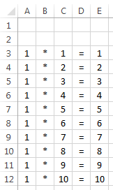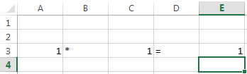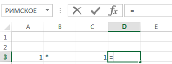 В ячейку А3 введите «1», в ячейку В3 – знак «*», в ячейку С3 – «1», в D3 – «=».