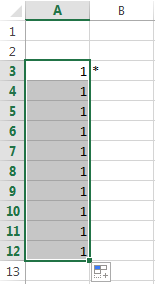 Выделите ячейку А3 и с помощью автозаполнения заполните единицами ячейки от А4 до А12.